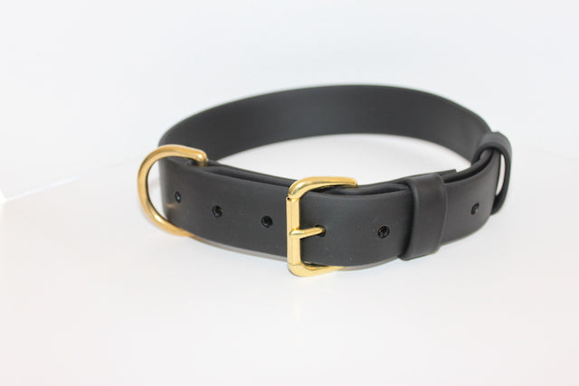Expertly crafted in NZ from Genuine Biothane, this collar provides the look and feel of leather without the maintenance and upkeep. The heavy duty Stainless Steel* or Solid Brass options make it perfect for active dogs, whether on the beach or on a walk. With its water-proof and odour-resistant properties, this collar is ideal for big strong dogs and easy to clean with warm soapy water. Only available in black in this width but accent colours in the keeper are available.